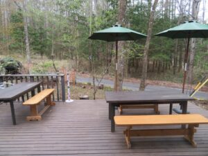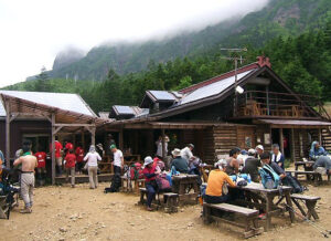 林間で川の音を聞きながらのゆるやかな登山道を登ると、2時間ほどで、古い山小屋の風情がたっぷりの「赤岳行者小屋」に到着します。小屋の前は広く、テーブルで休憩できます。