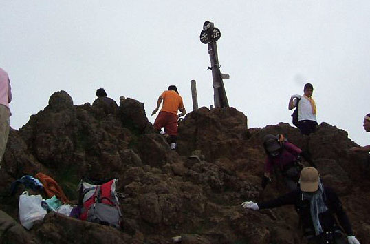 しんどい思いをした後の頂上は格別です。眺望も抜群で、天気がよいと富士山も見えます。この頂上は「南峰」で、すぐ隣に「赤岳頂上小屋」のある「北峰」があります。