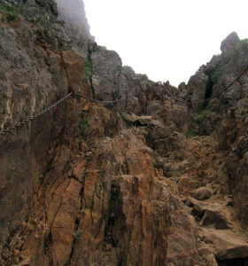 行者小屋を出てすぐ、阿弥陀岳との分岐を過ぎると、本格的な「山登り」が待っています。「文三郎道」と言う名前の、長い急な登りです。長い長い階段、クサリ場、最後は追い打ちをかけるような急な岩登りが待っています。