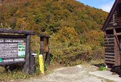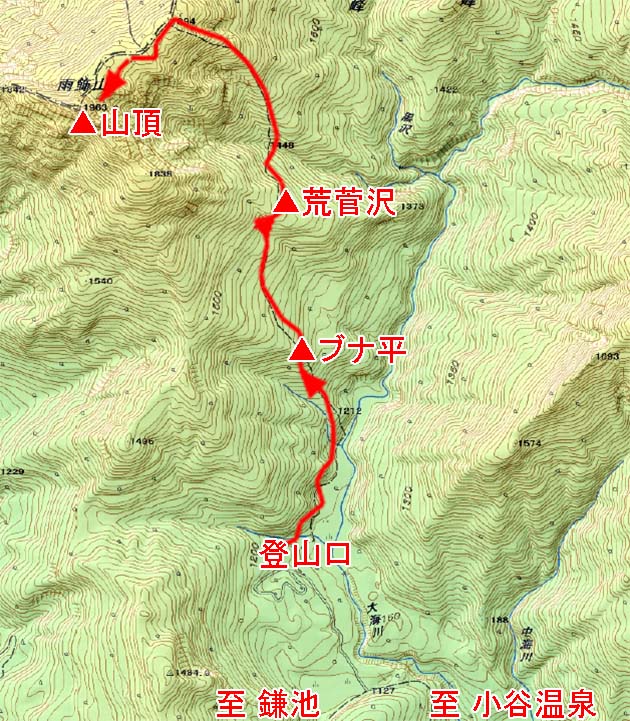 - 小谷温泉の雨飾荘などいくつかの施設を過ぎ、看板の地図のある三叉路を「キャンプ場」方面に右折