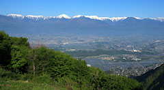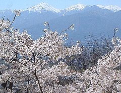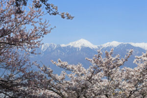 中間点付近に、桜の木を手前に、見下ろすと安曇野、その上に秋~春は雪を頂く北アルプスの素晴らしい眺めが望める箇所がいくつかあります。休憩しながら眺望を堪能しましょう。