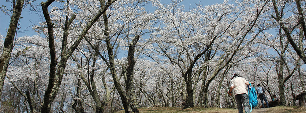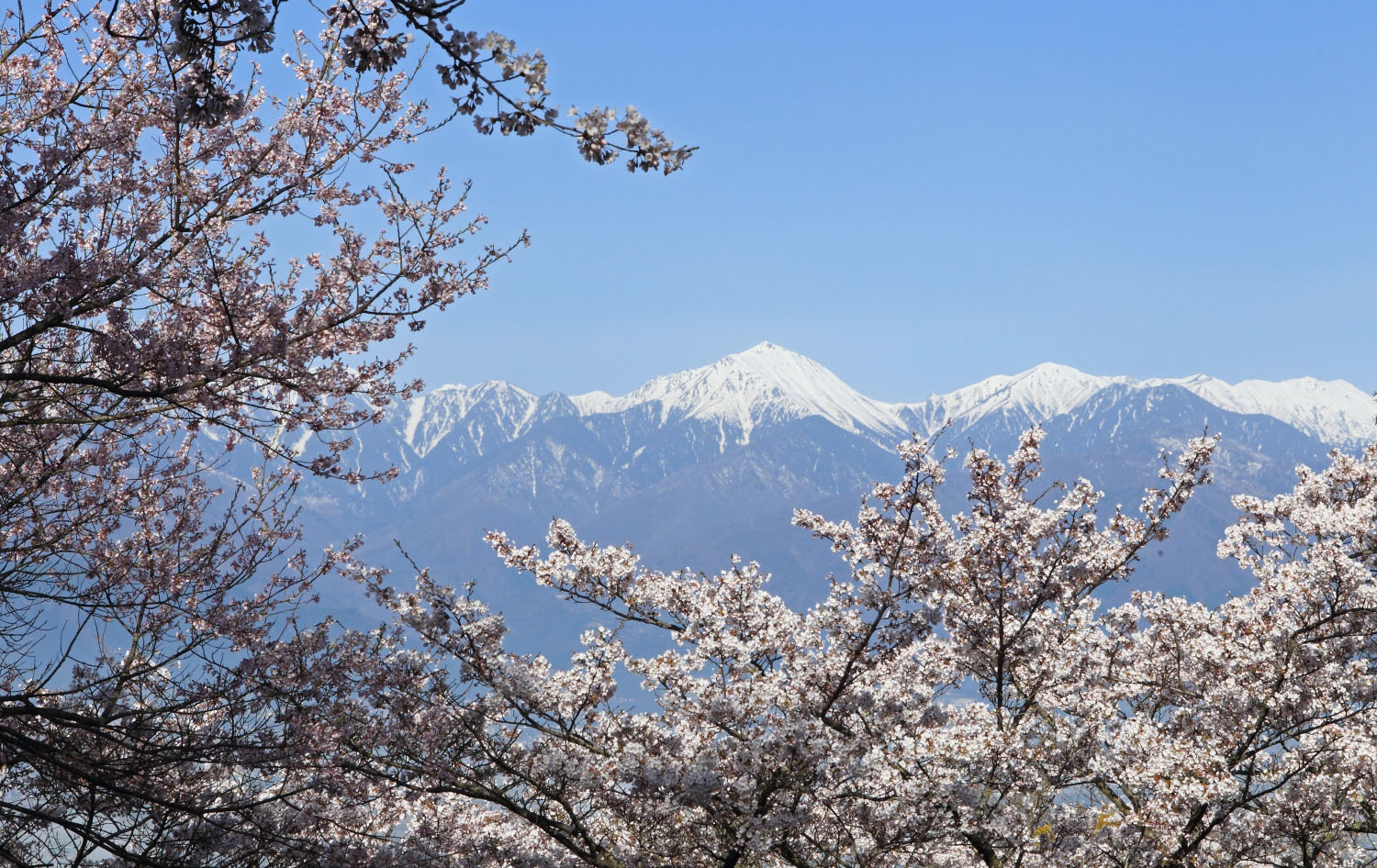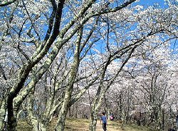 光城山の登山道には、麓から山頂まで約2千本の吉野桜が大正時代から植えられています。桜の咲く4月後半から連休にかけて、安曇野から、ピンク色の桜の道がまるで天につながる回廊のように見えます。桜が麓から順に咲いて行き、1週間ぐらいで光城山山頂まで駆け上がる様子は、安曇野の風物詩となっています。頂上付近まで車で登ることもできるため、普段は徒歩で登る人は多くないですが、桜の季節には、花見と軽登山を兼ねて家族連れなど大勢の人がハイキングを楽しみます。夜はライトアップもされます。