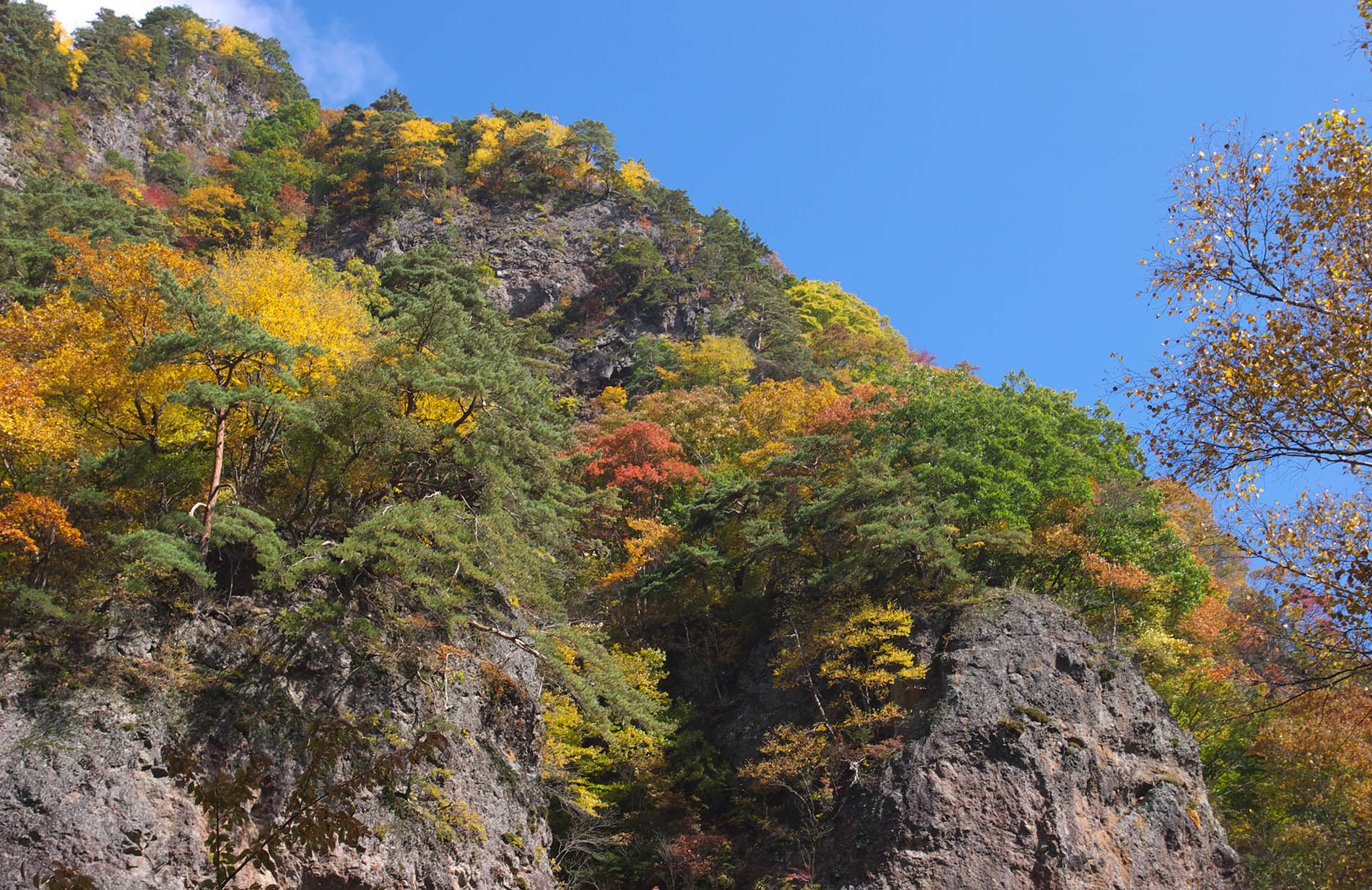 角間渓谷から見上げた紅葉と岩壁(写真:上田市マルチメディア情報センター)