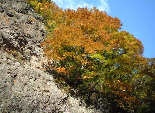 岩肌に生える木の紅葉