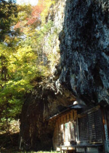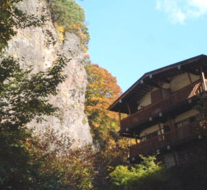 断崖絶壁の横に建つ一軒宿「岩屋館」は、こんな場所に建物があってだいじょうぶか心配になるほどですが、上田市から近い「秘湯」として人気があり、たくさんの方がお泊りになります。1000円で日帰り入浴できます。上田からのアクセス途中にも、真田温泉健康ランドふれあいさなだ館や千古温泉があります。