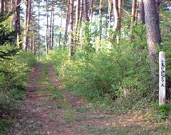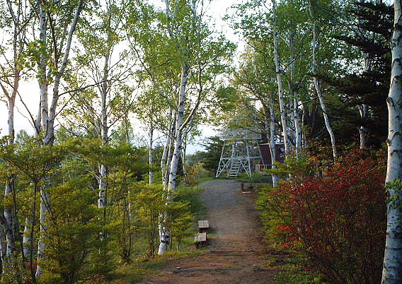 さらに進むと白樺林の向こうに「アルプス展望台」の鉄塔が見えて来ます。ここからのアルプス・伊那谷と天竜川の眺めは素晴らしく、また、「信州のサンセットポイント100選」に選ばれているアルプスに沈む夕陽は格別です。帰りは車道を通れば近いですが、遊歩道を適当に歩いて植物園経由で行くのが良いでしょう。