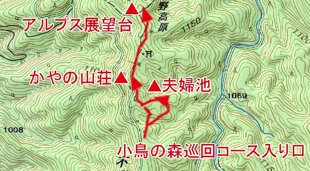 かやの山荘~アルプス展望台(約10分)~遊歩道入り口(約20分)