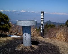 山頂からは、さえぎられるものの全くない360度の眺めです。方位盤も付けられています。槍・穂高・常念岳・白馬などの北アルプス、木曽駒ヶ岳などの中央アルプス、甲斐駒ヶ岳・仙丈岳・北岳・赤石岳などの南アルプスの3つのアルプスがすべて見えます。他にも、八ヶ岳、美ヶ原、霧ヶ峰、北信五岳なども見えます。「日本の中心地 分水嶺」と書かれた標識もあって感動的です。山頂の近くに、美しい貴重な山野草のオキナ草の自生地もあります。