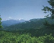 その先を少し行くと右にカーブして道が少し広くなります。ここは、昭和の始めに木材や人を運んだ森林鉄道の軌道だった所ですが、その面影は石積みや橋脚に少し見られるだけです。ここからは、ゆるやかな下りが多く、楽に歩けます。登り始めの分岐点に戻る手前に、ヒノキの巨木があります。このあたりは、上の写真のように、太平洋まで流れる木曽川の源流と天然林が美しいハーモニーを見せてくれます。分岐点を左に折れて入り口に戻ります。