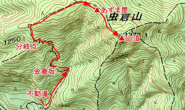 虫倉山への登山道は、四方からありますが、ここでは一番短い「不動滝コース」をご紹介します。