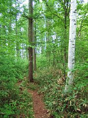 この辺りでようやく、林間から、美しい後立山連峰などの北アルプスを展望できます。尾根づたいに下ったり登ったりしながら歩きます。両側はけっこう絶壁です。ここも冬は雪が深いところなのか、曲がって生えている樹木が目立ちます。美しい白樺やダケカンバの木も多いです。