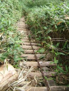 下り登山道の長い木製のハシゴ