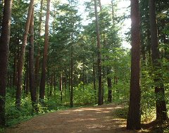 やがて、右側に舗装されていない道があるのでそちらに曲がります。赤松の葉がぎっしり敷き詰められた道が美しくゆるやかにカーブしています。ウッドチップの道と交差するので左に曲がって歩き、車道の手前を左に曲がって少し行って右に曲がると、車道を渡って直進できます。