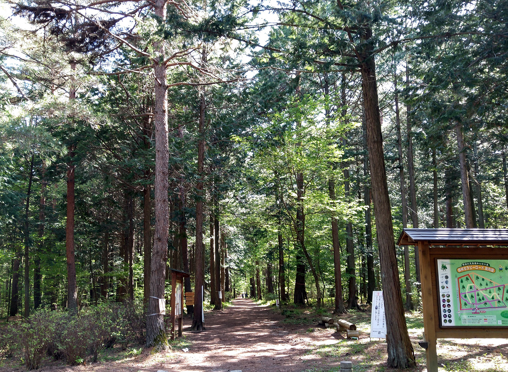 農道から向かって右側がこれらの施設で、左側は「みんなの森」として林の中を散策できる遊歩道となっています。アップダウンがほとんどなく、ウッドチップが埋めこまれて美しく整備された道は車イスでの散策も可能です。2006年に全国10ヶ所の森林セラピー基地・ロードの一つとして最初に認定を受けて「癒しの森」として登録され、2018年には道の駅にもなり、道標も整備されるようになりました。