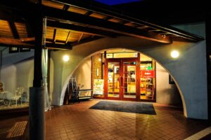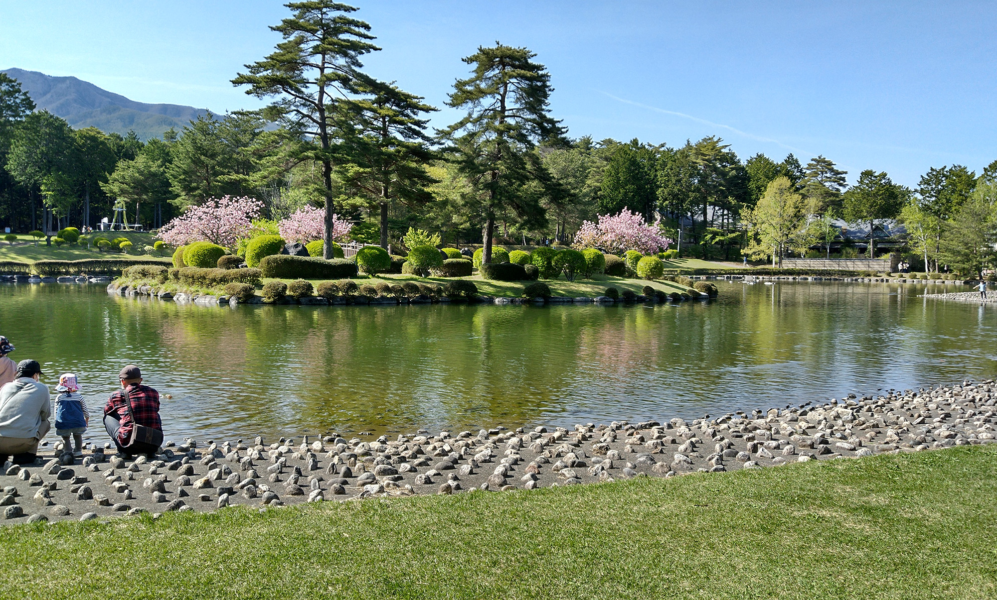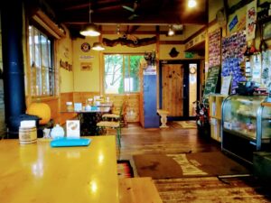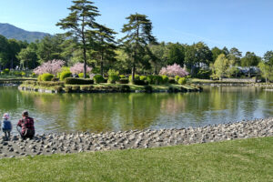 湖の反対側にある建物が、温泉宿泊施設の「大芝荘」と、農産物直売所・カフェ・パンやおやきのショップの「大芝高原味工房」です(「森のプチキッチン味工房」が2018年にリニューアルしました)。外側のテラスで、特産品として人気のジェラートやガレット(蕎麦粉のクレープ)などを食べるのもいいでしょう。2つの湖のほとりを回り、見事な芝生を横切って駐車場に戻ります。