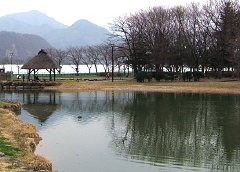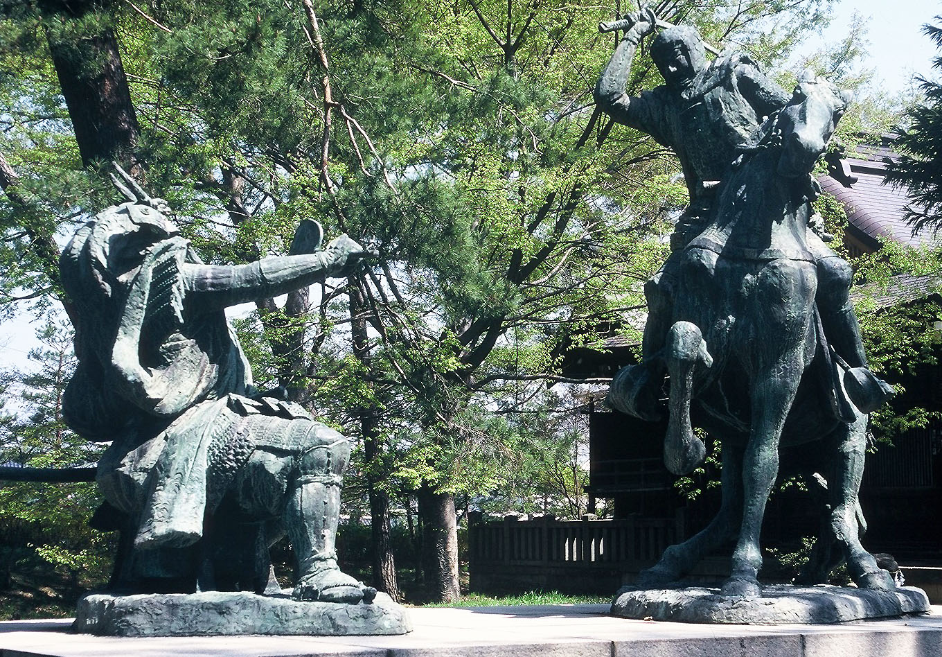 川中島古戦場の八幡原史跡公園は、松代と長野市街の間の道路の右側にあります。謙信と信玄が主人公の’69年のNHK大河ドラマ「天と地と」の時に建立された川中島の合戦の信玄・謙信一騎討ちの像と、その奥に長野市博物館があります。博物館の前の池も美しいです。信玄・謙信一騎討ちの像の横には両軍の戦死者を平等に葬い、後に謙信が「敵に塩を送る」エピソードの元になった首塚もあります。