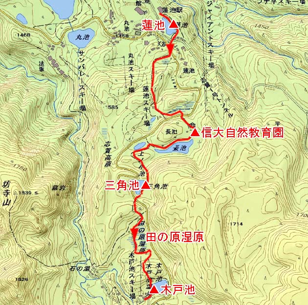 まず、蓮池の向かって左側を周回します。蓮池の反対側まで来たら、車道を2度横断して、蓮池スキー場の敷地に入ります。夏は「ワタスゲ平湿原」となっていて、6~7月に白いワタスゲやニッコウキスゲなど、高山植物が見られます。斜面を登り、途中で左下に折れて、また車道を注意しながら渡ると信大自然教育園に入ります。