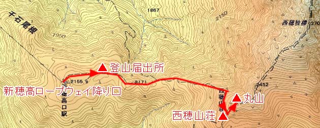 登山届出所~西穂山荘(約1時間半)~丸山(約10分)