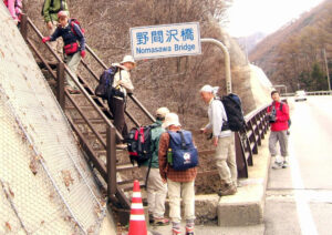 駐車スペースから、野間沢橋まで歩きます。トラックを含めた往来が多いので、クラクションを鳴らされたり、登山前に車に轢かれる、なんてことがないよう気をつけます。野間沢橋の手前にある鉄梯子が、戸谷峰に登る巡視路の入り口です。