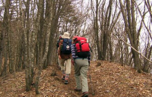谷沿いの道は狭く、けっこう急な登りです。ケヤキ・クルミ・ブナなどの雑木林を歩きます。春~初夏は気を付けて見ると、ニリンソウなどのいろいろな山野草の小さな花が見られます。