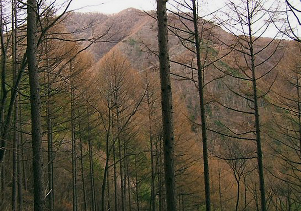 分岐点からは傾斜が楽になります。里山らしく、鳥の声が聞こえます。右側が谷なので視界が良く、木々が、紅葉の時期は特に、美しいです。300mほど行くと、また標識がある分岐があり、鉄塔の方に登る道に左折します。この辺りはアカマツが多く、高度が上がるとアカマツよりカラマツが多くなります。