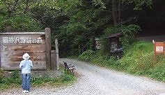 「軽井沢野鳥の森」の大きな看板の左の砂利道(小瀬林道)を歩き始めます。右側には、別荘地に行く舗装道路があり、その手前の壁に、日本野鳥の会の創設者中西悟堂氏のレリーフがあります。左側の橋を渡った奥に見える建物は、星野リゾートの人気高級宿泊施設「星のや」です。