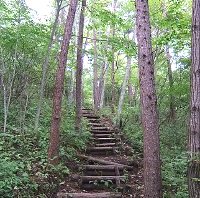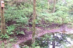 雑木林の中の遊歩道を歩きます。ところどころに登りがありますが、勾配はそれほど急ではなく、子供でも登れます。30分ぐらい歩いた所で標識に従って左に少し登ると、野鳥を窓から観察できる横長の小屋があります。