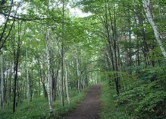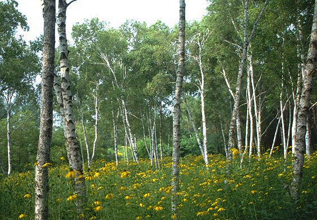 八ヶ岳自然文化園の入り口からすぐ見える「自然観察館」の建物の右横から、「八ヶ岳農場」の矢印の標識に従って舗装された歩道を入ります。少し行くと右側に舗装されていない遊歩道に分岐しているので右折します。やがて左下に自然文化園内のフィールドアスレチックコースが見え、上の写真のような見事な白樺林の中を通る道になります。