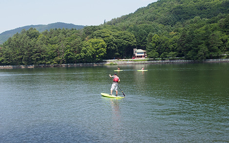 最近流行らしい写真のSUP(スタンドアップパドルボード)をやっていたり、周りはキャンプ場が取り囲んでいる他、100年前から開かれているサマースクール「信濃木崎夏期大学」の会場の素敵な建物があったり、JRの駅とは思えない田舎のバス停のような小さな駅があったり。
