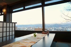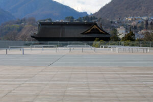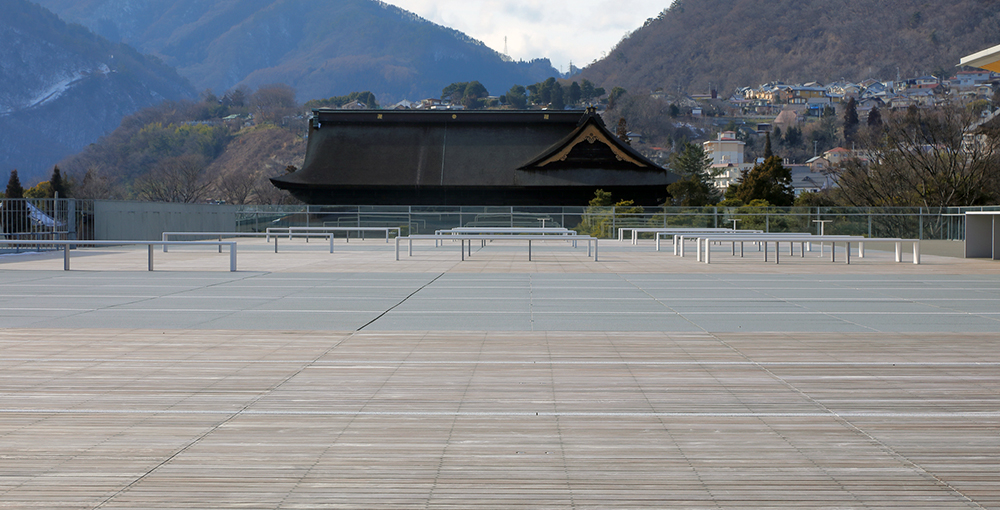 2021年に建て替えられた際、無料では入れる屋上広場「風テラス」と中庭に「水辺テラス」ができました。カフェもある屋上広場や2階のレストランからは、「ランドスケープ・ミュージアム」として善光寺や北信州の山並みが見られます。