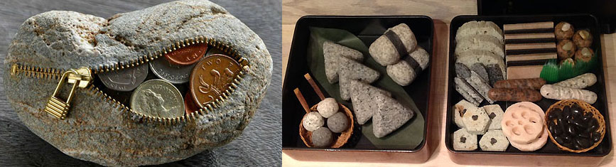 ギャラリー自遊石外観梓川から拾って来た石ころなどが、名前通り、ユーモアあふれる作品に生まれ変わっていることに驚きます。石で作られたシャツ、財布、顔、食べ物などの作品は、日本各地はもとより、海外でも展覧会に出品され、ポスターやTVでも使われました。城山公園にある「いわさきちひろの椅子」も伊藤博敏さんの作品です。