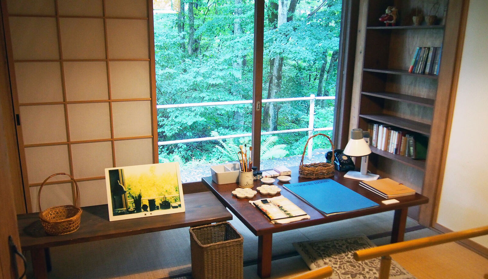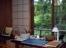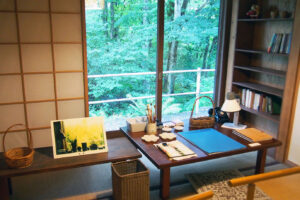 いわさきちひろ黒姫山荘の書斎喫茶店の奥、童話館の左隣には、いわさきちひろ黒姫山荘もあります。絵本の制作を行なった家を、お風呂まで自由に見ることができます。人気の高い東京や安曇野のいわさきちひろ美術館と違い、来場者が少なく、静かにいわさきちひろさんの愛した場所を見られる素晴らしい場所です。