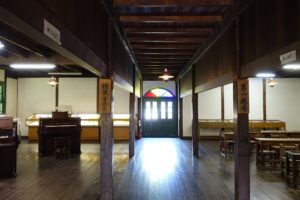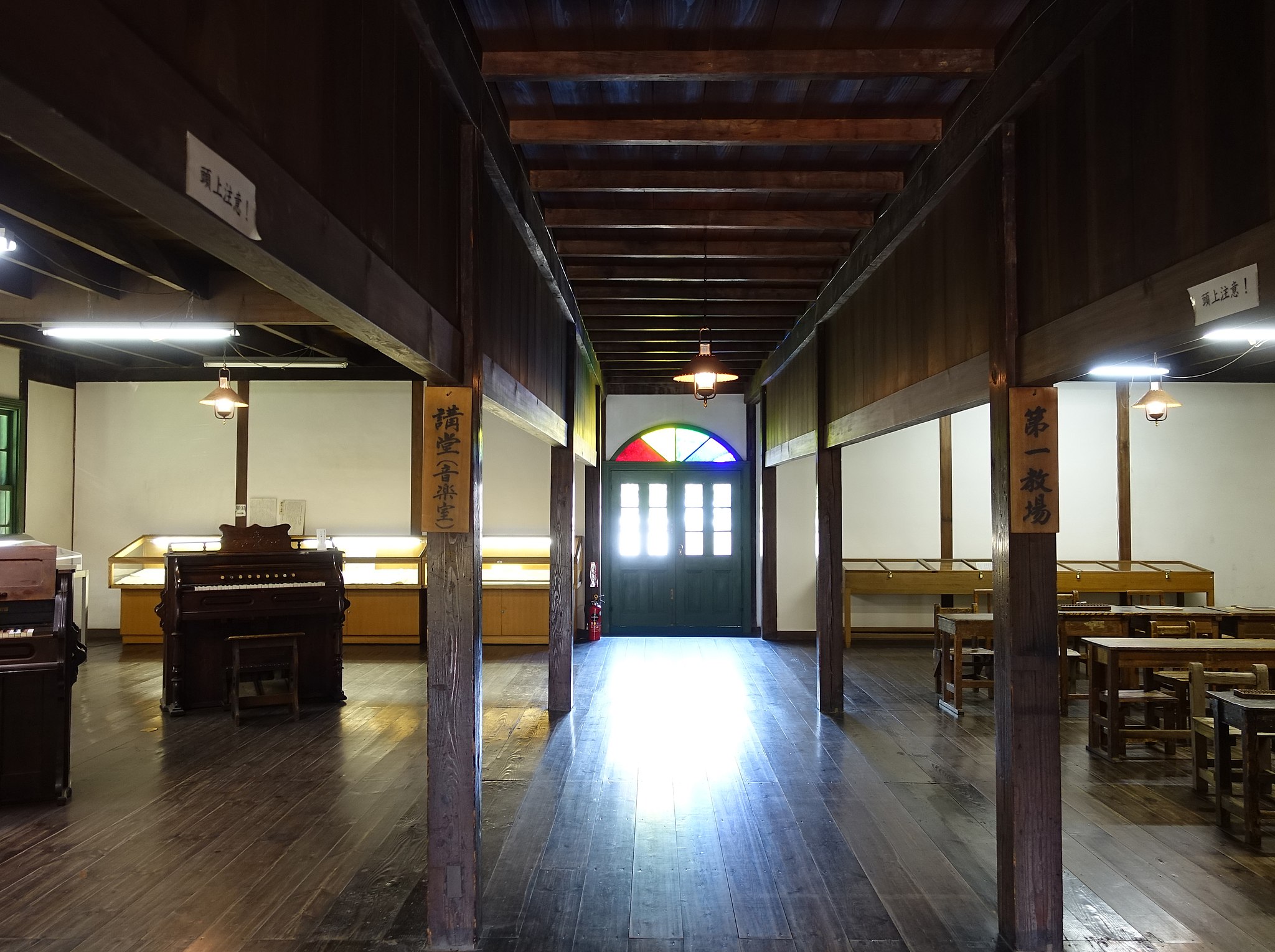 2階の中廊下などに美しいステンドグラスの丸窓があり、ガラス自体が当時は珍しかったため「ギヤマン(江戸~明治時代の言葉で「ガラス」のこと)学校」とも呼ばれていました。