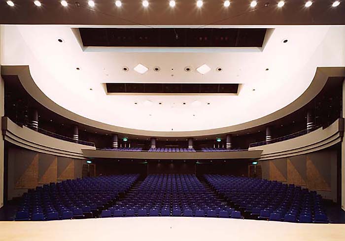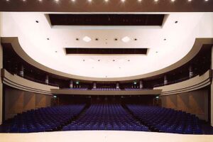 大ホール内部は全体に円形のデザインで統一されており、特に2階席左右はホールを包み込むように配置された、ユニークな構造です。また、ホールに入る際も、建物入り口からいったんインナーコリドー(連絡通路)に入って、そこからホール入り口を入ることになります。このインナーコリドーも美しく、特に用がなくとも歩いてみたい気持ちになります。