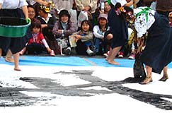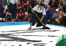 髪に墨が付かないようタマネギスタイルにした「書道ガールズ」たちが、顔も服も墨だらけにして路上で「演じる」書道は若さがあふれていて、迫力。