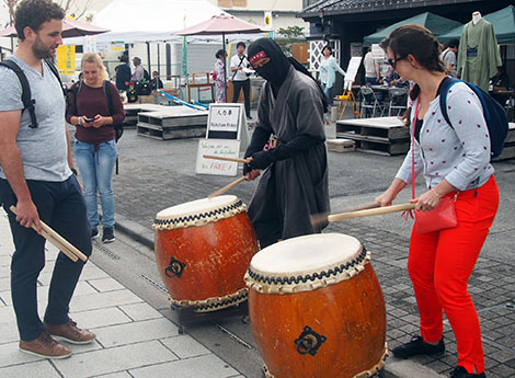 茶道・書道・折り紙・扇子・日本酒・吹き矢・人力車、いろんな体験がどれも外国人に人気でしたが、中でも以外と人気だったのが、竹馬。けん玉や太鼓演奏も簡単にチャレンジできて人気でした。