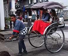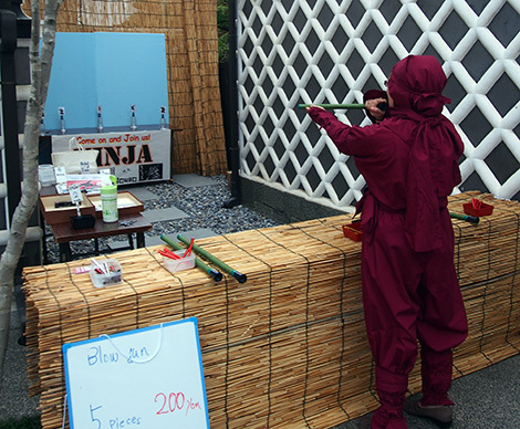 会場の蔵シック館の外では、忍者服を着て、吹き矢体験や、人力車試乗。土間ではけん玉も。