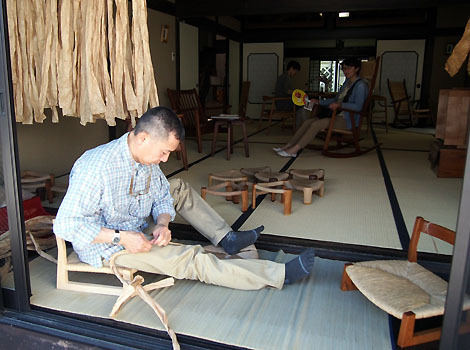 木曽の方が、木の椅子の座る部分に、紙をよって作ったひもを張って作るのを実演されていて、面白かった。