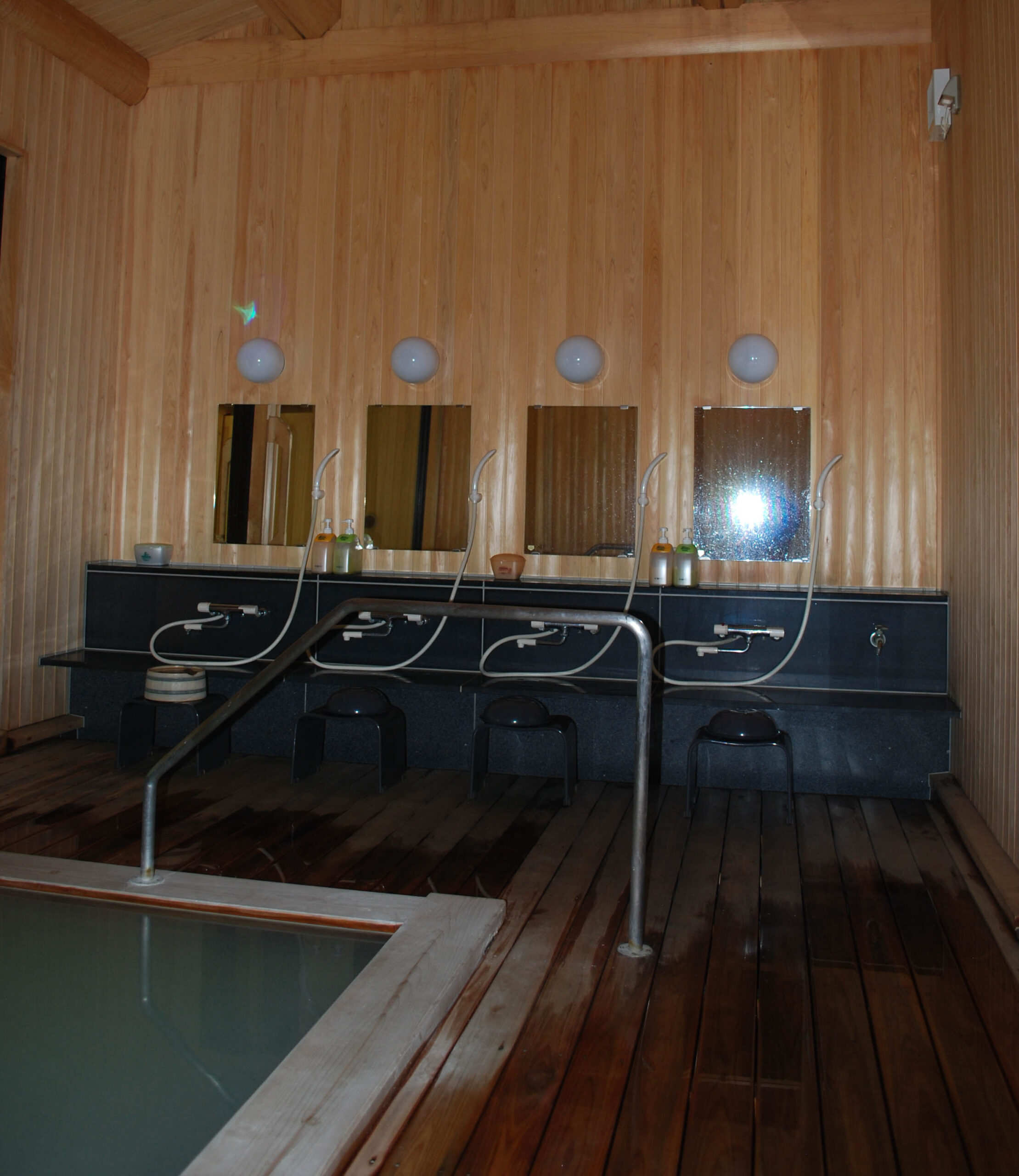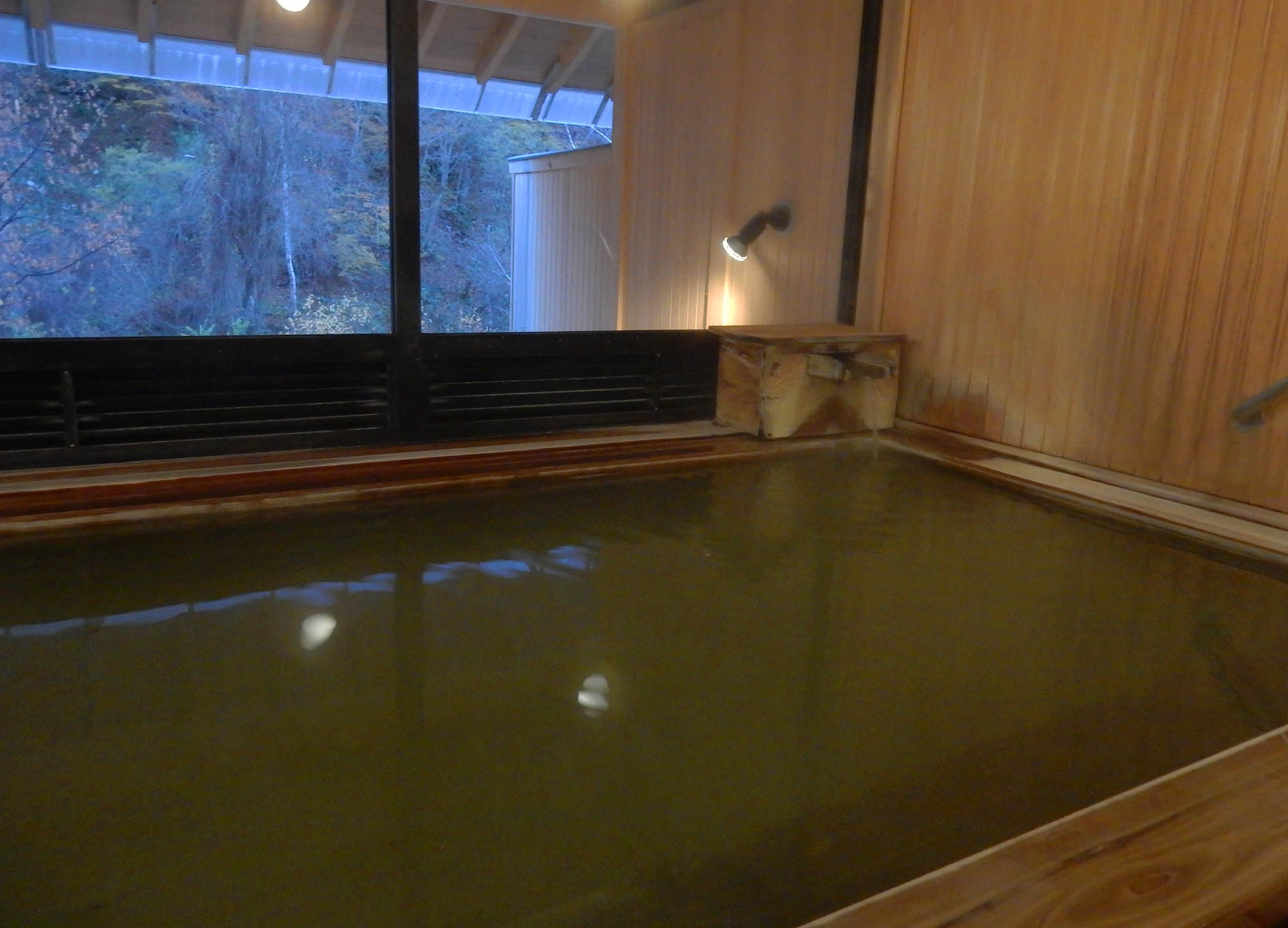湯船・天候・その時々により、5つの色(乳白色、クリーム色、濃緑色、コバルトブルー、黒色)に変わると言われる不思議なお湯です。