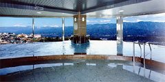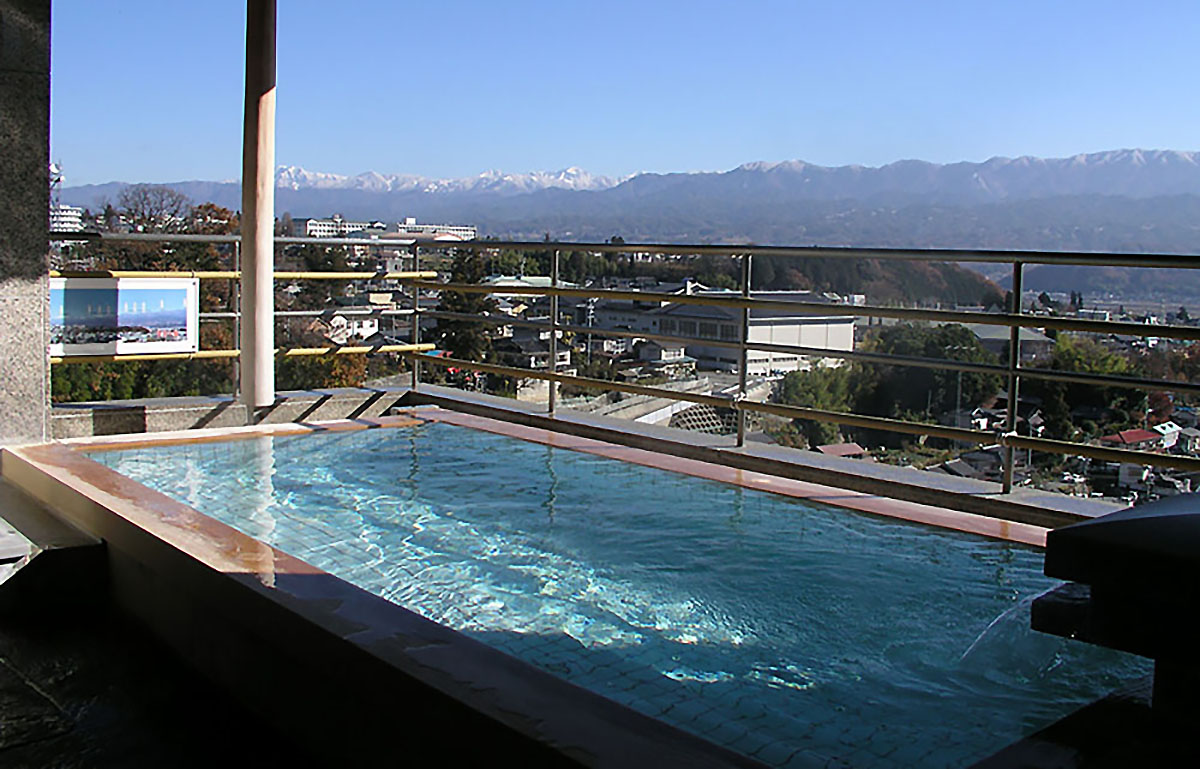 一軒宿の「天空の城 三宜亭本館」の大浴場からは、露天風呂・広い内湯とも、南アルプスや飯田市街の大パノラマが望めます。