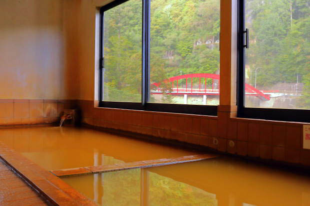 明るい茶色の温泉は風情があり、エメラルドグリーンの木曽川を見ながら入れますが、反面、国道19号からは丸見えです。そのため、洗い場はカーテンで仕切られていて見られないようになっています。