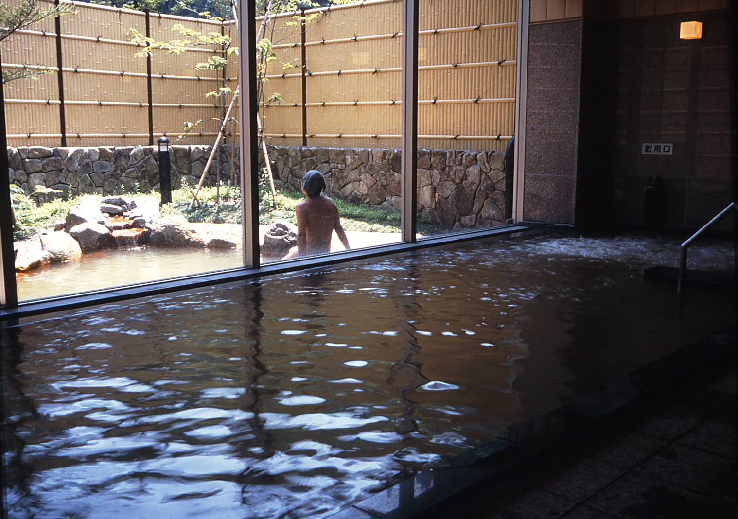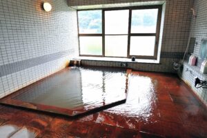 お湯は、35℃の来馬温泉と、75℃の北小谷温泉からの引湯を混合して、少しぬるめのいい温度になっています。内湯はあつ湯・ぬる湯・水風呂・寝湯があり「あつ湯」も41℃です。加水も加温もしない「完全掛け流し」です。