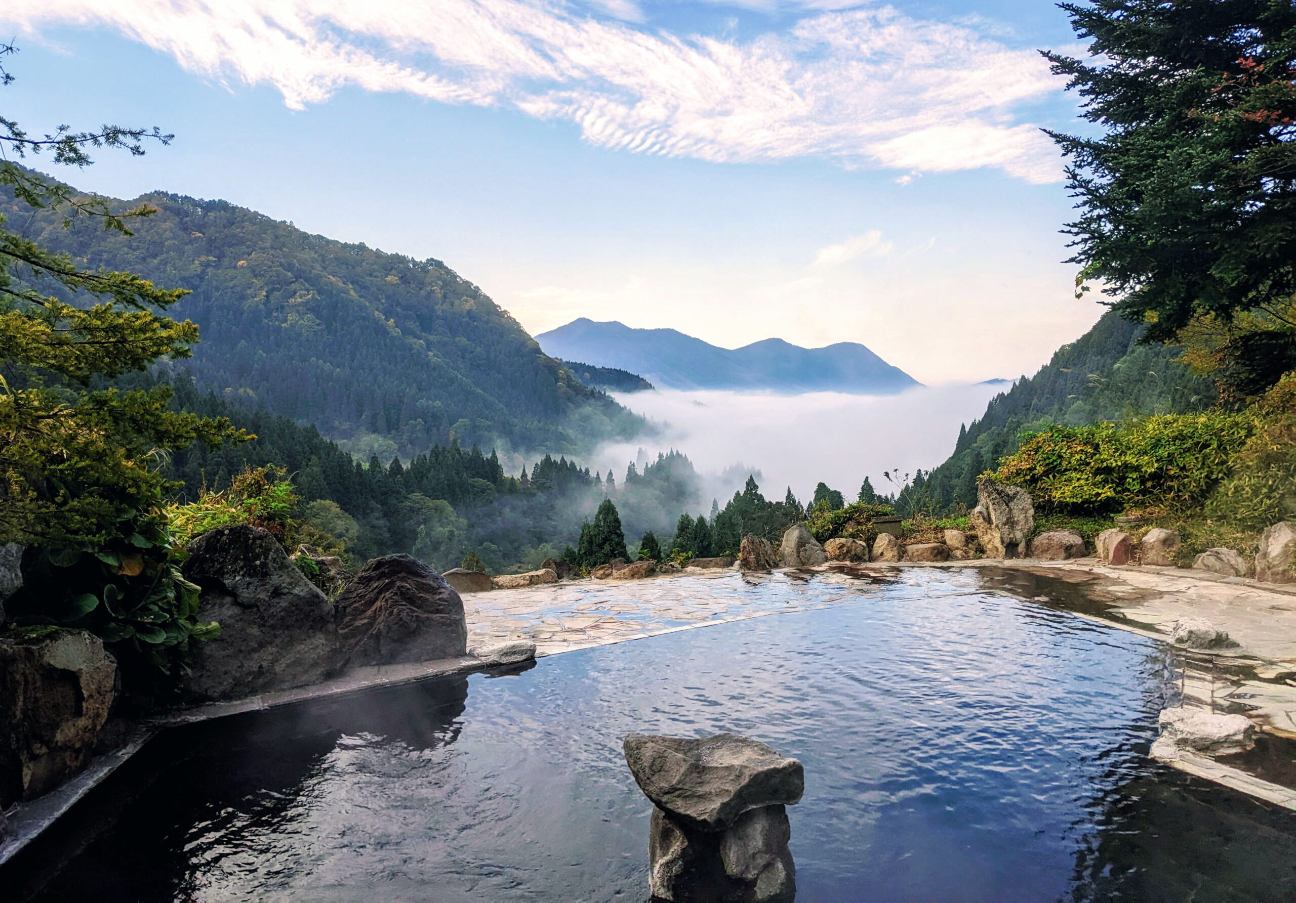目前の高社山から飯山平、さらには遠く北アルプスを一望できる広い露天風呂が人気で、大賑わいです。「雪景色の素晴らしい温泉」ランキングで東日本一位になったこともあります。