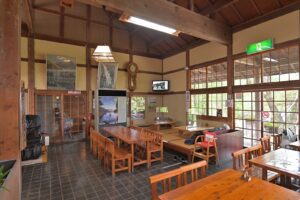 内風呂の浴槽は檜造りです。自炊の宿泊施設「梨の木荘」も併設されています。