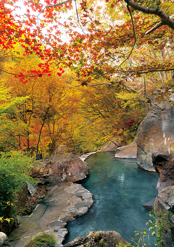 小さな駐車スペースのある入り口(写真)と、奥の駐車場からの入り口があり、どちらも急な坂を下りて行くと売店を兼ねた料金所があります。脱衣所と岩の内風呂は男女に分かれていて、その先に大きな露天の岩風呂があります。混浴ですが、横に長く、男湯からと女湯からの入り口は離れている上、「タオルで腰を隠して入るように」とか「写真撮影禁止」と書かれているので、女性でも比較的安心して入れます。紅葉のシーズンの10月は、松川渓谷の紅葉を見ながら露天風呂につかれます。