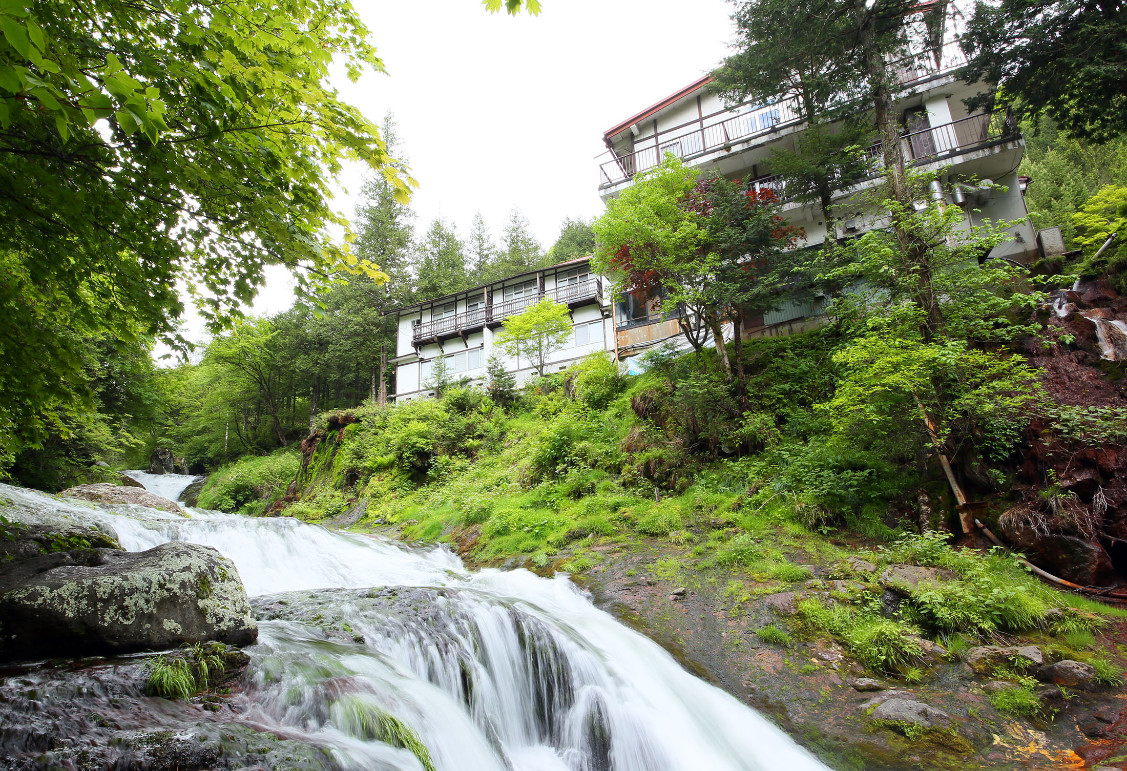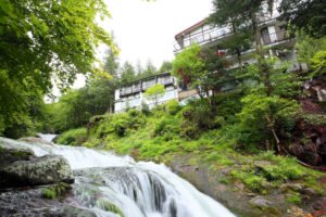 明治温泉は、乙女滝温泉・横谷温泉・渋川温泉・渋の湯温泉と共に、奥蓼科温泉郷の内の一つです。国道152号線から、東山魁夷の名画「緑響く」のモデルで、紅葉の名所として近年人気の御射鹿池の横を通り、急な下り坂を下ったところにあります。右側を滝が流れていて、温泉からも見ることができます。