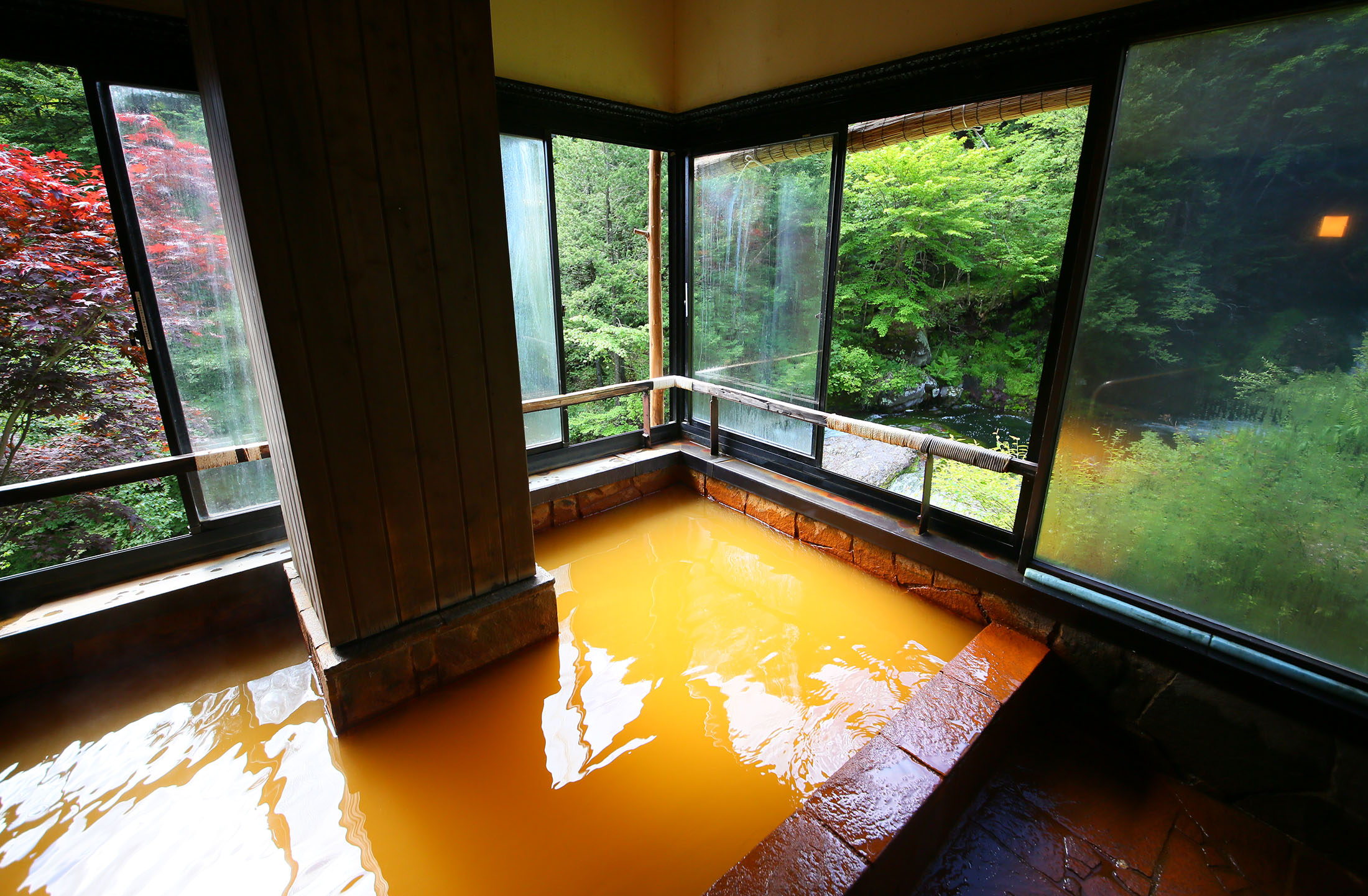 打たせ湯の湯船が源泉そのままですが、25℃なので冷たく、内湯は逆に熱めに加温してあります。窓を開けたら露天になる半露天風呂は、濾過循環していないため、加温された鉄分が褐色に酸化しています。