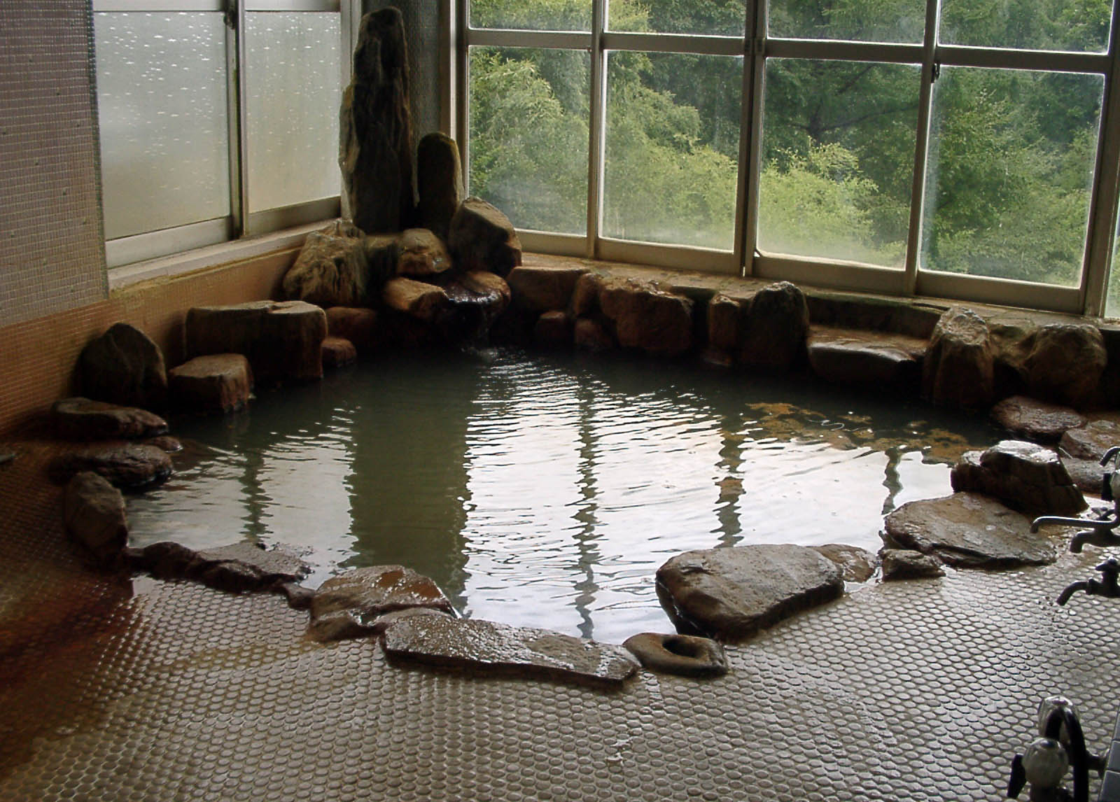 お湯は特徴的で、加熱していない源泉槽のほうは、ほぼ透明で、底に湯の華が沈んでいます。それに対して、加熱した温浴槽のほうは、鮮やかなオレンジ色の湯の華が浮かんでおり、湯自体も多少緑褐色を帯びています。