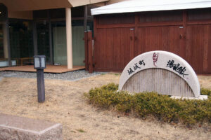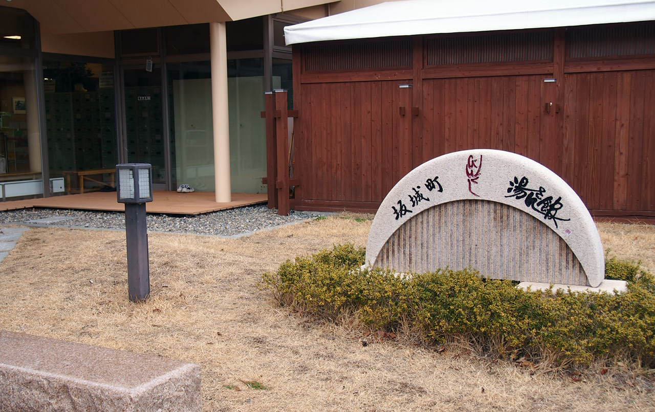 びんぐしとは、髪を整えるくしの一種で、その形に似ているのでびんぐし山と言うそうです。びんぐし湯さん館の建築も、一部びんぐしをイメージして設計されています。また、写真手前の石碑や温泉のロゴは、毎年近くの千曲川で鮎釣りをする「釣りキチ三平」の漫画家の矢口高雄さんによるデザインです。