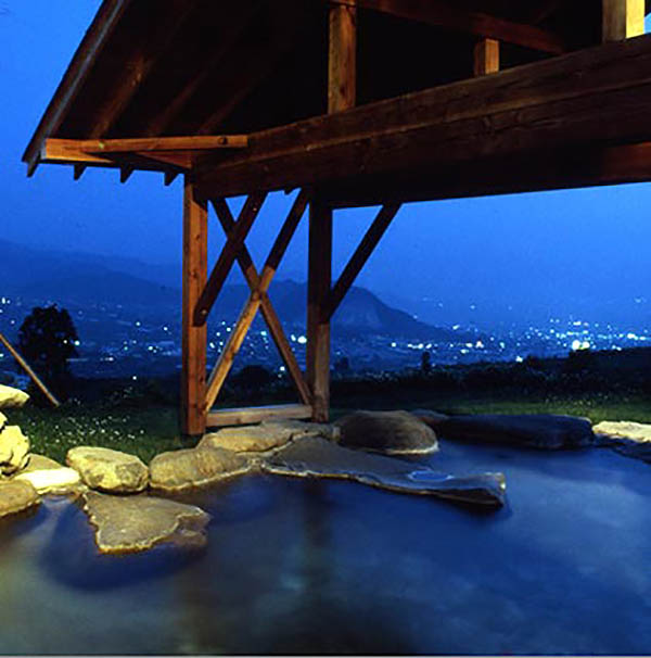 「遠見の湯」は、広い露天風呂と洗い場があり、内風呂はありません(ホテル内にある大浴場は日帰り入浴はできません)。丘の上のロケーションで、その名の通り、見晴らしは抜群。夕陽や市街地の夜景も美しいです。また、スキー場のそばにあるので、冬はしばしば雪見風呂を楽しめます。ホテルセランには、貸切家族風呂「ちくま乃湯」・「しなの乃湯」もあり、日帰り入浴もできます。